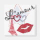 Love with a French twist. Red and blue design with Eiffel tower, star, hearts, and lipstick kiss.