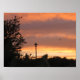 Silhouette of oak leaves, a lamp post, and a bird in flight...against a beautiful pink sunset.