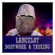 Closeup view of a helmet and an plate armour of a mediaeval knight against the colourful background which imitates the outer space or a battlefield to your liking. Text - Lancelot - Bodywork & trueing - added
