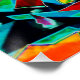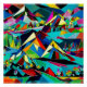 A.I. created interpretation of a vibrant geometric cubist landscape composition depicts stylized mountain peaks and trees in a bold array of colors.