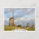 Photo postcard of three windmills and sheep looking into the camera under beautiful clouds in the sky in a lovely spring landscape in the countryside in the Netherlands with a white edge and the text 'Netherlands'.