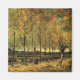 Lane with Poplars by Vincent van Gogh is a vintage fine art post impressionism landscape nature painting. Poplar trees line the street and people are walking along a road with a village in the distance. A church is in the centre of town. The leaves are golden and about to fall off the trees in the autumn season.