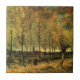 Lane with Poplars by Vincent van Gogh is a vintage fine art post impressionism landscape nature painting. Poplar trees line the street and people are walking along a road with a village in the distance. A church is in the centre of town. The leaves are golden and about to fall off the trees in the autumn season.