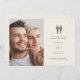 This wedding invitation features an elegant and minimalist design that beautifully balances sophistication with simplicity. At the top, a delicate line art illustration of two grooms walking hand in hand sets a graceful and intimate tone. The couple's names are prominently displayed in a classic serif font, followed by a heartfelt invitation in a modern, handwritten script, which adds a personal touch.