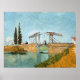 Langlois Bridge at Arles. Vincent van Gogh. Cute autumn landscape. Drawstring stone bridge over the river. A man is walking across the bridge. The blue river flows under the bridge. Clouds are running across the blue sky. Reproduction of famous works of art images in the public domain.