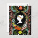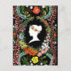 This postcard records a love poem written by a boy to a girl in the "language of flowers", the Victorian-era means of communication in which various flowers and floral arrangements were used to send coded messages, allowing individuals to express feelings which otherwise could not be spoken. Starting with the left side of the wreath to the right side, each flower reveals one more part of the missing puzzle. Included in the poem are amaranth globes, black eyed susans, daisies, poppies, dandelions, tulips, morning glories, roses, magnolias, laurel leaves, laurestine, forget-me-nots, honeysuckle. Try to decipher the poem with your guide here: http://en.wikipedia.org/wiki/Language_of_flowers Queen Victoria's silhouette dramatically takes centre stage on the black background as a symbol of the era and as a lover of beauty and wearer of flowers in the hair.