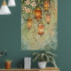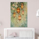 It features several intricate, hanging lanterns glowing warmly against a soft, green, botanical backdrop.