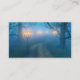 Four glowing lamps on four lampposts shine through dense fog, illuminating a winding path through the shadows and bare banches of winter trees.
