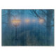 Four glowing lamps on four lampposts shine through dense fog, illuminating a winding path through the shadows and bare banches of winter trees.