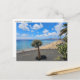 A picture perfect view of a beach on the island of Lanzarote in the Canary Islands printed on a postcard.