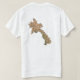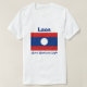 An editable title and slogan accompanies the white circle centred over a blue band with red bands above and below of the Lao flag on the front of this t-shirt. The back displays a detailed map of Laos.