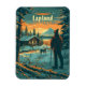A serene and nostalgic depiction of Lapland, Finland, showcasing its pristine Arctic wilderness, snowy landscapes, and unique cultural heritage. The design features the region's iconic reindeer herds, Northern Lights dancing in the night sky, and cosy log cabins surrounded by snow-covered forests, all illustrated in a vintage style. This artwork captures the serene beauty and adventurous spirit of Lapland, inviting viewers to experience its magical atmosphere and Arctic wonders.