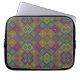 Laptop sleeve featuring a colorful, intricate geometric pattern of diamonds and squares in blue, green, yellow, and pink. The design conveys a vibrant, playful tone.