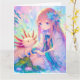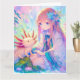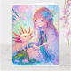 A super big Birthday card for a girl with colouring page on the inside. Pretty pink, blue and purple anime girl with flower in her hair playing with an axolotl.