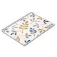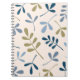 Illustrative surface pattern design of assorted leaf silhouettes in blues and faux gold colour on a cream colour background.