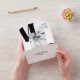 Modern minimalist all in one wedding invitation in white with your initials in a big bold font in black beneath a photo of the two of you.