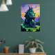 A large blue fantasy creature with four legs, tail, green fur and many sharp teeth in the mouth, forest and mountain in the background with a colourful sky. This is a AI generated art.