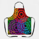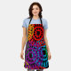 This apron has a Black History design of large circles formed from raindrop shapes and circles in red, yellow, purple, green, and turquoise.
