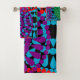 This towel set has a Black History design of large circles formed from raindrop shapes and circles in red, yellow, purple, green, and turquoise.