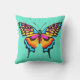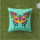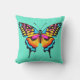 Pillow in a large swallowtail butterfly in bright, primary colours of orange, turquoise and fuchsia pink, accented with black