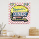 Create your own custom, 1950's style diner sign wall poster using this easy template. These cool retro posters have a slightly distressed pink-and-white chequered background with a sign on top that says "DINER" and "OPEN" in neon with space for you to add your own first or last name - or any other word you'd like. The sign also has a lighted arrow graphic and space for you to add a slogan and the year your diner, home kitchen or 50s theme bar was established (or the year your party is being held). It's all done in shades of pink, white, black, blue, yellow, grey and red. Just fill in the easy diy template or click "Customise It" if your text runs long & you need to resize, rearrange or change text colours & fonts. Don't forget to pick the poster size you want (square shapes work best for this design).