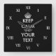 Large square Keep calm and your text wall clock. Make your own funny keep calm and carry on parody. Vintage typography template with latin numbers and crown. Fun examples: Keep calm and party on. Keep calm and love me. Keep calm and stay positive. Custom background colour.