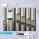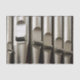 A close up view of metal organ pipes showing the mouths of the pipes as they descend in size along the row. Would make an ideal wrapping tissue for any organist or church musician.