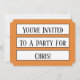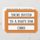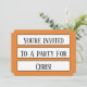 Design description: Tiled black and white rectangles in a subtle interlocking background design. As shown, on a standard orange background. Customisable. Front text template reads "You're Invited!" Back text template for date time location. Gluten-free and No Gifts/charitable contribution template text on back.