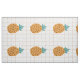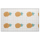 Cartoon illustration of pineapples and a light brown and white grid in the background decorate this fun pineapple upholstery fabric. The print is large and suitable for use in various home decor, art, and crafts projects.