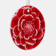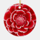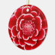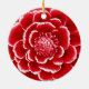 Ornament in a large closeup image of a dahlia flower in shades of deep red, accented with white