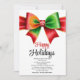 Large red, green bow and stripes Christmas holiday card. The front of the card prominently features an impressive large red and green coquette bow, centered with a delicate snowflake. The cheerful phrase "Happy Holidays" is written in bold script typography. The back reveals an appealing pattern of irregular red and green stripes, playfully scattered with snowflakes.