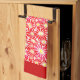 A festive poinsettia holiday pattern kitchen towel with large red and dark pink flowers and deep red borders.