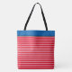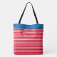 This tote bag is shown with a fun Red and White striped print design with a Marine Blue colour top panel. Large size shown. Has Black straps.
