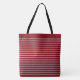 This tote bag is shown with a fun Crimson and Grey striped print design. Large size shown. Has Black straps.