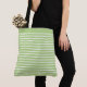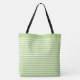 This tote bag is shown with a fun Lime and white striped print design. Large size shown. Has Black straps.