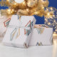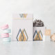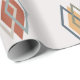 This wrapping paper has a mid-century modern design of sets of two diamond outlines with one solid diamond, in greys, gold, orange, blue, and tan, scattered about the design on a field of off-white. If you like the design but prefer different colours, message me.