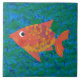 A colourful Large Ceramic Tile, with a cheeky Orange and Yellow Fish on a Deep Blue and Green background, from a whimsical hand-painted paper collage by Judy Adamson. Part of the Posh and Painterly 'Fish in the Sea' collection, this pattern can be adjusted to fit any Tile so you can also change the scale if you wish. You can customise this Tile further by removing the Blue/Green background layer and choosing a plain colour. Alternatively, you can remove the Fish Motif. (Add a wooden frame to use as a Trivet.)