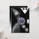 A swanky art deco couple wearing black tie apparel - she's in a low cut, silver leopard gown and he's chic in a black tuxedo. The centerpiece is a casino chip that contains custom text and tumbling siver dice. Whether you're getting married in Vegas or staying in your home town and throwing a casino themed event, this versatile, trendy invitation is perfect for any special occasion - retirement parties, milestone birthdays, cocktail & dinner parties, rehearsal dinners, wedding receptions, anniversaries, semi-formal and formal events or festive holiday soirees. Easy to personalise, use the "Customise It" button above to add your own text. Matching favour stickers also available. For questions or special requests, please contact the designer: cheryl@cheryldanielsart.com. If this invite is not exactly what you're looking for, all of my products can be custom designed to accommodate your specific needs. "Las Vegas Art Deco Birthday" invitation by Cheryl Daniels © 2014.
