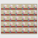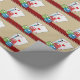 This gift wrapping paper has sets of cards showing blackjack with a stack of chips beside them. The background is tan with a border line that is red black and tan.