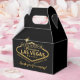 Personalised welcome to fabulous Las Vegas light sign in faux gold foil on a black gable box with custom wording on the back for creating a hangover helper welcome kit for guests at your destination wedding. The boxes are nice and small, perfect for holding some pain reliever, hydration powders, B vitamins, mints or gum, and a certificate or voucher for breakfast. The text can be changed entirely if you have a different use in mind, and several variations are available in the Paper Grape Destinations Zazzle designer store as well.