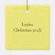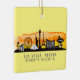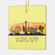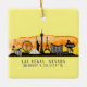 Ceramic ornament features Las Vegas Nevada city skyline silhouette with sunset watercolor splash on pale yellow background and latitude & longitude coordinates. Personalise with name or message on back.
