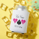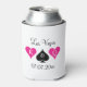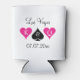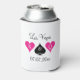 Las Vegas theme monogrammed wedding can coolers. Neon pink and black playing card suits design with name initials of bride and groom plus date of marriage. Elegant script typography. Cute poker theme beverage holder with stylish monogram. Also nice for cosy engagement or anniversary party. King and queens of hearts design.