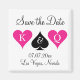 Las vegas wedding save the date magnet with neon pink hearts. Personalised monogram design with initials of bride and groom plus date of marriage. Monogrammed King and queen of hearts. Poker playing card suits, hearts and spades.