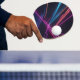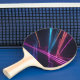 Bright magenta, yellow, orange, and blue lines like laser lights on a black background creates an eye-catching ping pong paddle. Very high-tech and modern design!