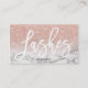 An elegant modern, stylish lashes business card with elegant script hand lettering style typography in white on a faux rose gold pink glitter ombre on modern white marble background. If you need any customisation, don't hesitate in contacting me.