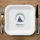 Nautical blue and white bridal shower / bachelorette party paper plates with sailboat and phrase "last sail before the veil". Personalise it with your event details.