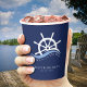 Nautical blue and white bridal shower / bachelorette party paper cups with ship helm and phrase "last sail before the veil". Personalise it with your event details.