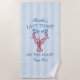 Toast the bride at the beach with these cute coastal bachelorette party beach towels. "Last Toast on the Coast" appears in summery blue lettering, with an illustration of a red lobster clinking two champagne coupe glasses. Personalise with the bride's name and destination.