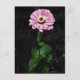 A photograph of a pink Zinnia, with double pink petal flower with yellow stars, in a garden.