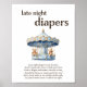 Add some laughter to your twin boy baby shower with this adorable "Late Night Diapers" game poster! Featuring a sweet watercolor illustration of two cute teddy bears on a whimsical pastel blue carousel, this charming sign invites guests to write funny, sweet, or encouraging messages on diapers to give the parents-to-be a much-needed smile during late-night changes. The elegant yet playful design perfectly complements a twin-themed baby shower, making it a delightful addition to your event décor. Order yours today to create a fun and memorable baby shower activity!